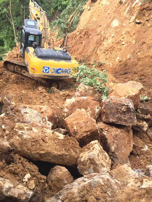 7月13日早7點(diǎn),響徹云霄的鞭炮聲過(guò)后,所有機(jī)械開始作業(yè)。挖掘機(jī)工作7小時(shí)推進(jìn)到6米的時(shí)候,山體出現(xiàn)了滑坡,好在提前做了排險(xiǎn)處理,未出現(xiàn)任何施工事故。道路基線均處在滑坡地帶、山體內(nèi)所含石料60%為整石、40%為孤石含雜松軟黏土,這為施工帶來(lái)了很大難度,工作進(jìn)度也非常緩慢,到了晚上22點(diǎn),道路才勉強(qiáng)推進(jìn)到9米。