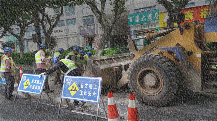 龍溪路現(xiàn)場施工工人冒雨工地清理銑刨剩余瀝青