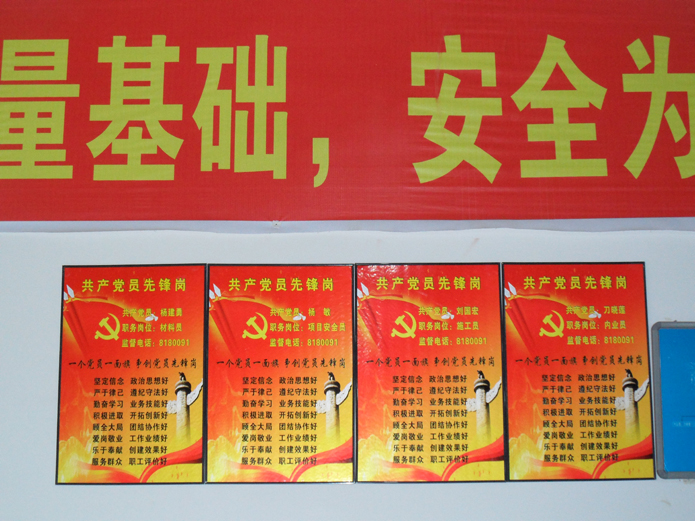 活動提出“讓身份亮起來,讓旗幟樹起來”。為此,黨支部制作了“共產(chǎn)黨員先鋒崗”標(biāo)牌,標(biāo)牌上標(biāo)注姓名、職務(wù)崗位、監(jiān)督電話,標(biāo)牌掛在科室辦公室、項目部辦公室的醒目位置,接受群眾職工監(jiān)督。