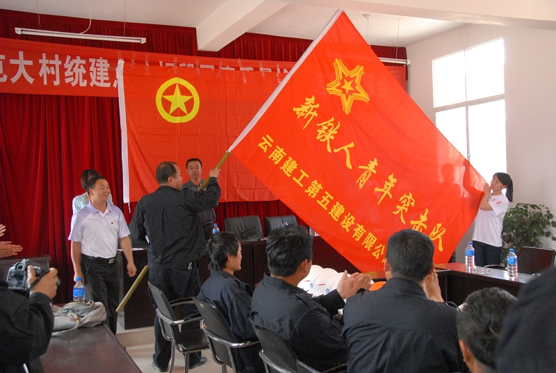 圖為集團(tuán)公司團(tuán)委副書記雷棲為項目部青年突擊隊授旗