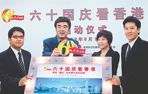 6月10日,為慶祝新中國60周年華誕,香港旅游發(fā)展局與中國青年報(bào)社聯(lián)合舉辦的“六十國慶看香港”系列活動正式啟動。香港特別行政區(qū)政府駐北京辦事處副主任陳選堯、中國青年報(bào)總編輯陳小川、香港旅發(fā)局中國內(nèi)地總監(jiān)葉貞德和著名歌唱演員蔡國慶(從左至右)一同為活動揭幕。
