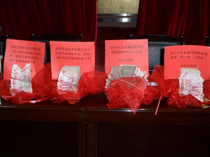 第一安裝直管部本次兌現(xiàn)的項目分別是:昆明市人民檢察院職務(wù)犯罪偵查指揮中心辦公樓安裝工程,兌現(xiàn)金額172407.03元;金江小區(qū)6#-10#地塊房屋建筑工程第三標(biāo)段安裝工程,兌現(xiàn)金額70253.63元;金美百貨等改造工程,兌現(xiàn)金額17112.28元;昆明經(jīng)濟技術(shù)開發(fā)區(qū)電子信息產(chǎn)業(yè)創(chuàng)業(yè)中心消防、通風(fēng)及室外管網(wǎng)工程,兌現(xiàn)金額100000元。四個項目在大會上獲得了相應(yīng)的現(xiàn)金兌現(xiàn)。