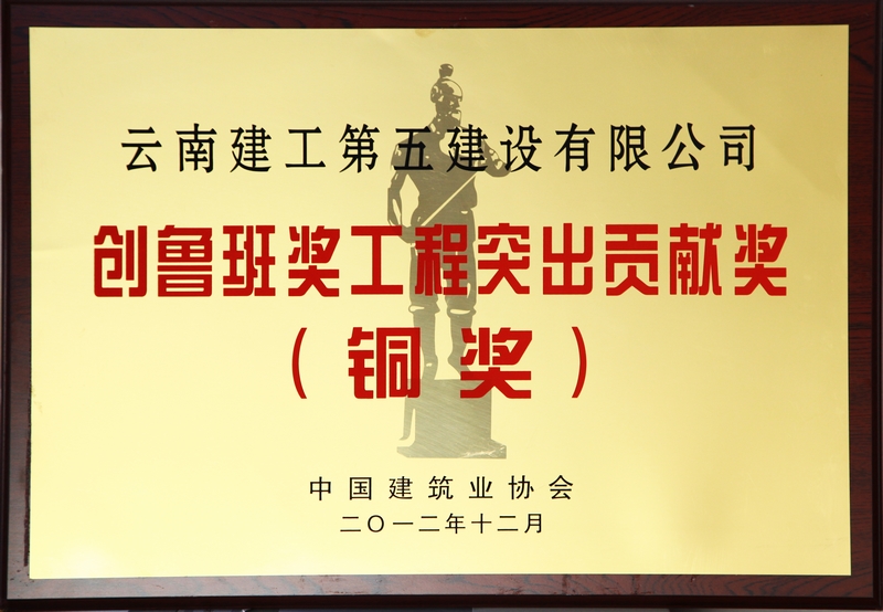 2012年12月公司榮獲中國(guó)建筑業(yè)協(xié)會(huì)頒發(fā)的創(chuàng)魯班獎(jiǎng)工程突出貢獻(xiàn)獎(jiǎng)(銅獎(jiǎng))。
